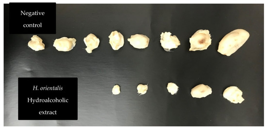 Hydroalcoholic extract was selected to treat tumor bearing mice, as it showed the highest activity in the in vitro experiments. Treatment of tumor-bearing mice with H. orientalis L. hydroalcoholic extract showed significant (p < 0.05) reduction of tumor size (−46.94%) compared to the negative control (107.01%) (Table 6 and Figure 8; Figure 9). The percentage of mice with no detectable tumor in hydroalcoholic extract-treated group was 50%. In addition, mice exhibited normal activity with no side effects.