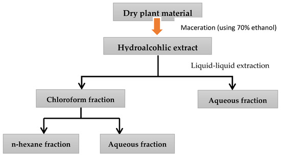 H. orientalis L. was purchased from the United Arab Emirates market. The taxonomic identity of the plant was authenticated by botanists in the royal society for the conservation of nature, Amman, Jordan. Fresh plant was dried at 30 °C with ventilation, powdered mechanically, and stored in well-closed glass containers in a dry–dark place. Moisture content was determined using oven-drying method [38]. Briefly, powdered plant material was weighed and dried in oven at 135 °C for 2 h. The weight was measured again after drying to calculate the moisture content. Different extracts were prepared by different solvents. Hydroalcoholic extract was prepared by macerating the plant dried powder in 70% ethanol (1 L per 100g) in a lab mixer for three days. After that, the extract was filtered, and the supernatant was concentrated using rotary evaporator. Complete drying of the extract was performed using lyophilizer, and then the extract was kept at −20 °C until used. Water, aqueous methanol, chloroform, and n-hexane fractions were prepared from hydroalcoholic extract using liquid–liquid fractionation method. These solvents were selected as they help to separate phytochemicals based on their polarity. Hydroalcoholic extract was subjected to solvent–solvent partitioning between chloroform and water. One hundred grams of hydroalcoholic extract was mixed with 100 mL chloroform followed by adding 100 mL water with continuous mixing. The two solvents were loaded in a separating funnel (250 mL volume) and left to separate overnight. Each solvent was collected in a clean beaker and the solvents were evaporated using rotary evaporator. After drying both fractions, the chloroform fraction was also subjected to solvent–solvent partitioning between n-hexane and aqueous methanol (Figure 10). All the fractions were dried completely and stored at −20 °C until used [39]. Figure 10 summarizes the extraction preparation and solvent—solvent partitioning.