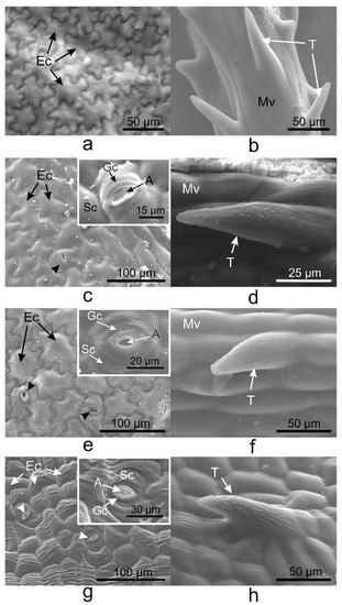 Scanning electron microscopy (SEM) micrographs showing the adaxial (upper) epidermis of the Vinca leaves with an overview of the differently shaped epidermal cells and insets with a detailed view of stomata, indicated by the arrowheads (a,c,e,g), and non-glandular trichomes observed on the midveins (b,d,f) and secondary veins (h). (a,b) V. minor, (c,d) V. major, (e,f) V. major var. variegata, (g,h) V. herbacea; A—aperture, Ec—epidermal cell, Gc—guard cell, Mv—midvein, Sc—subsidiary cell, T—trichome.