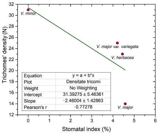 Linear fit of the trichomes’ density and stomatal index on the adaxial side of the examined Vinca leaves.