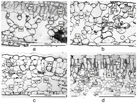 Semithin cross-sections of Vinca leaves showing the organization of the mesophyll between the upper epidermis (Ue) and lower epidermis (Le) as determined through light microscopy. (a) V. minor, (b) V. major, (c) V. major var. variegata, (d) V. herbacea; Ia—idioblast, Pp = palisade parenchyma, scl—sclerenchyma, Sp = spongy parenchyma, vb = vascular bundle.