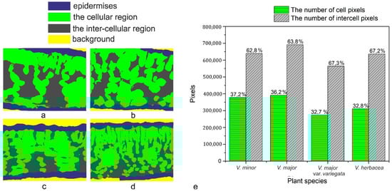 Computational estimation of the intercellular space of the mesophyll. (a) V. minor, (b) V. major, (c) V. major var. variegata, (d) V. herbacea, (e) graphical representation of the estimated number of cell pixels and inter-cell pixels as calculated using the Python script.