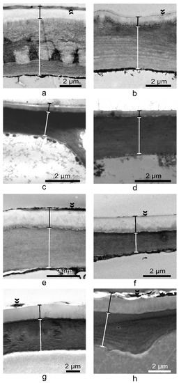 Transmission electron microscopy (TEM) micrographs of the ultrastructure of the upper (a,c,e,g) and lower (b,d,f,h) epidermises of Vinca leaves. (a,b) V. minor, (c,d) V. major, (e,f) V. major var. variegata, (g,h) V. herbacea; white delimitations represent the cell wall of the epidermal cells, and black delimitations represent the cuticular layers; double arrowheads indicate the epicuticular waxes.