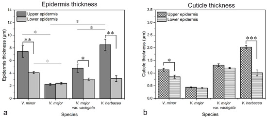 The thickness of the upper and lower epidermises was measured with the help of TEM images. The results showed that the upper epidermis is significantly thicker than the lower epidermis for V. minor (p = 0.005), V. major var. variegata (p = 0.03), and V. herbacea (p = 0.0002), and of all species, V. major had the thinnest cell walls on both epidermises (Figure 8a). Also, the cuticle present on the upper epidermis was thicker than the cuticle on the lower epidermis for V. minor and V. herbacea (Figure 8b).