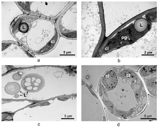 TEM micrographs of the cells located in the spongy parenchyma of (a) V. minor, (b) V. major, (c) V. major var. variegata, and (d) V. herbacea leaves; cl—chloroplast, L—lipid droplets, pg—plastoglobules, *—mitochondrion.