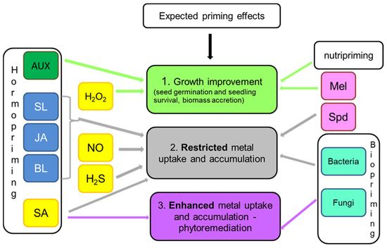 Considering plant cultivation under exposure of metallic elements, the desired goals of priming can be directed either to improve seed germination, survival, and biomass accretion or to reduce uptake and transport of toxic ions in plant organs. Obviously, all priming agents are applied to achieve improved plant growth and yield, but some of them are also particularly effective in restricting metal accumulation. Analysis of available reports shows that the highest potential for decreasing metal accumulation in plant organs has chemical priming with the use of NO and H2S donors, as well as with triamine–spermidine (Figure 1). NO and H2S affect plasma membrane proteins, mainly transporters and antiporters [68,78,82], whereas spermidine and its complexes take part in metal chelation and influence metal transportation within plant tissues [122,123]. The metal content in biomass can be also reduced by priming with PGRs with growth-inhibiting properties: JA, brassinosteroids, and strigolactones [169,174,175]. Among other techniques, the use of biopriming with selected bacterial bioremediator strains allows achieving a significant decrease in toxic metals accumulated in the plant yield [179,183,185]. There are also reports indicating that nutripriming with Se is effective in reducing the as content in the grains and thus restricts its circulation in the food chain [136].
