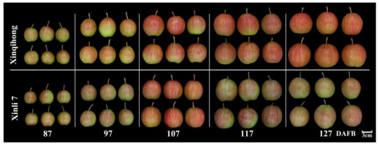 Phenotype of ‘Xinqihong’ and ‘Xinli 7′ red pear varieties at different stages of fruit development. (DAFB: days after full bloom).