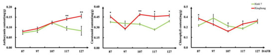 We measured the levels of pigment molecules in the fruit peel at different fruit development stages (Figure 2) and found that the anthocyanin content increased rapidly from 87 DAFB in both red pear varieties. The anthocyanin concentration in ‘Xinli 7′ reached a peak at 107 DAFB before declining, whereas that in ‘Xinqihong’ continued to increase. Carotenoid content in the pericarp was significantly higher in ‘Xinqihong’ than in ‘Xinli 7′ at 107 DAFB. There were no differences in chlorophyll content between the two cultivars at any stage.