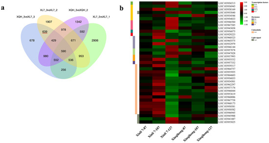 Differentially expressed genes (DEGs) were identified in the comparison of Xinli 7_2 vs. Xinli 7_3 that did not overlap with those identified in the comparison of Xinqihong_2 vs. Xinqihong_3. After removing the DEGs from the Xinli 7_1 vs. Xinli 7_2 and Xinli 7_3 vs. Xinqihong_3 comparisons, 639 DEGs remained (Figure 3a and Supplementary Table S1); these were selected for further analysis as candidate genes related to the fading of the red color of ‘Xinli 7′ fruit peel.