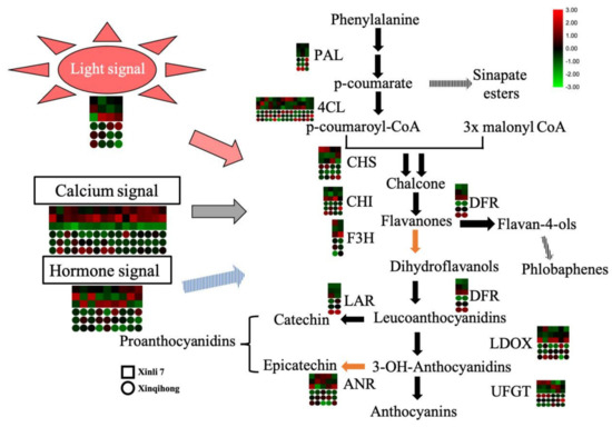 - Liu, Z.; Zhang, Y.; Wang, J.; Li, P.; Zhao, C.; Chen, Y.; Bi, Y. Phytochrome-interacting factors PIF4 and PIF5 negatively regulate anthocyanin biosynthesis under red light in Arabidopsis seedlings. Plant Sci. 2015, 238, 64–72. [Google Scholar] [CrossRef]