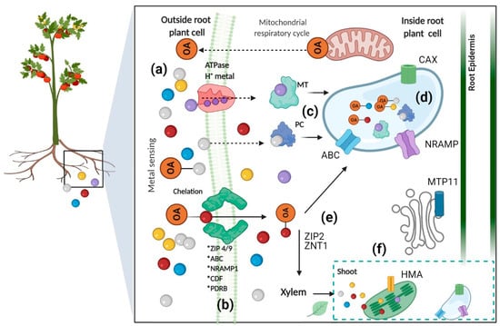 Every battle in this fight for survival has a starting point; in the case of metal toxicity, the interaction between an increasing soil metal concentration and root epidermis sensing and signaling seems to be the first step []. Once the plant has established a first defense line involving the exclusion and chelation of metal ions with OA, another strategy follows. In many cases, as previously mentioned, this relies on a metal concentration threshold []. This strategy involves the tolerance or entrance of the complex formed by metallic ions and OAs into the cell (metal–OA complex). As described in the next subchapters, the expression of transporters to liberate OAs and chelating compounds to neutralize these elements in the rhizosphere is one of the main strategies triggered in plants under conditions of metal/metalloid stress.