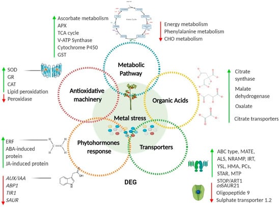 General diagram of the Gene Ontologies (GOs) of up- and downregulated genes under different metal stress conditions in plants by transcriptomic analysis. Venn diagram showing the differentially expressed genes (DEGs) up- (green arrow) and down- (red arrow) regulated that belong to the GOs of reactive oxygen species (ROS) production and antioxidative machinery, transporter-like genes (plasma membrane or vacuoles), metabolic pathways (such as the TCA cycle, which provides OAs) and phytohormonal genes in responses to As(V), Cd, Pb, and other metals. Colored circles: heavy metals, CHO: carbohydrates, TCA: tricarboxylic acid, APX: ascorbate peroxidase, ERF: Ethylene Response Factor, AUX/IAA: Auxin/Indole-3-Acetic Acid, ABP1: Auxin binding protein 1, TIR1: Transport inhibitor response 1, SAUR: small auxin upregulated RNA, OsSAUR21: auxin-responsive SAUR gene family member of Oryza sativa.