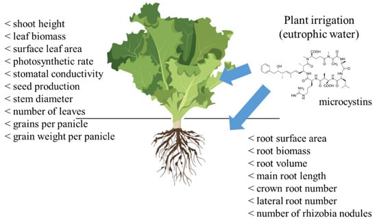 Main physiological and growth effects reported in agricultural plants irrigated or grown with microcystin (MC)-rich waters. Plant image is from BioRender (https://biorender.com/, accessed on 28 February 2021).