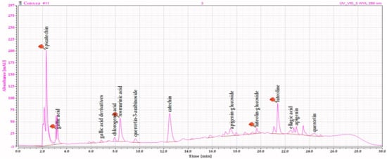 | 4 | apigenin-7-O-glucoside | 6.345 ± 0.012 | ellagic acid | 3.435 ± 0.012 |