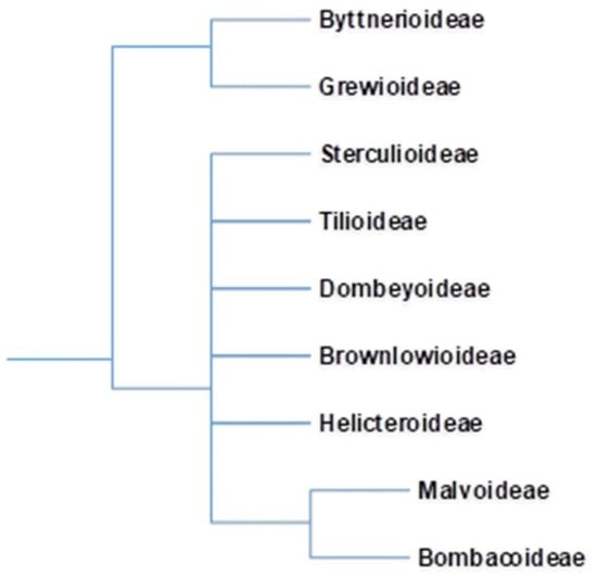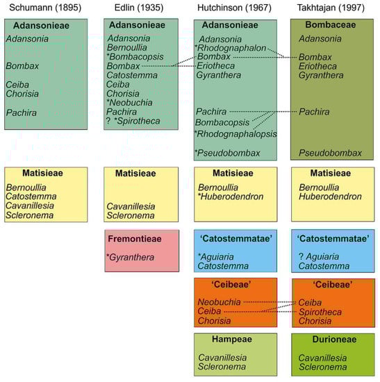 Taxonomic location of Bombacoideae as per different systems of classification. Dotted lines specify the changes in the genus limitation and the genera, which is described after the previous action, and are specified by a symbol (*), while the citation marks represent the tribes which are not validly published. Reproduced with permission from Carvalho-Sobrinho et al. [4] (originally Figure 1).