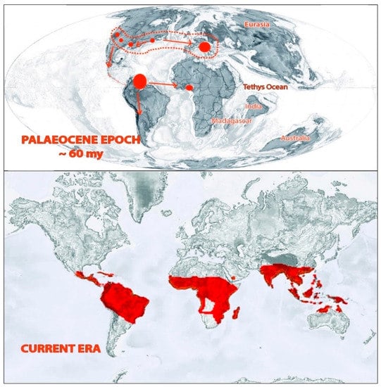 Distribution of Bombacoideae in past and present eras. Adapted from Krutzsch, [20], Zizka et.al. [11], and Angiosperm Phylogeny website version 14 (www.mobot.org/MOBOT/research/APweb; accessed on 10 January 2021).