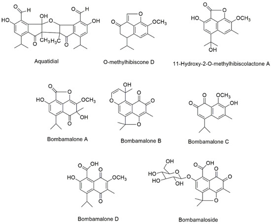 Aquatidial (Figure 4) was previously isolated from a chloroform extracts of P. aquatica roots together with the known compounds lupeol, triacontyl p-coumarate, and isohemigossypolone [72]. Aquatidial is a new bis-norsesquiterpene with an uncommon skeleton, putatively derived from isohemigossypolone. Two new naphthofuranones, 11-hydroxy-2-O-methylhibiscolactone A and O-methylhibiscone D (Figure 4), have been extracted from the P. aquatica stems [48].