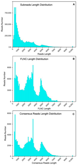 Numbers and length distributions of 9,350,222 subreads (A), 254,692 full-length non-chimeric (FLNC) sequences (B), and 132,536 consensus reads (C) with PacBio single-molecule real-time sequencing method of purslane (Portulaca oleracea).