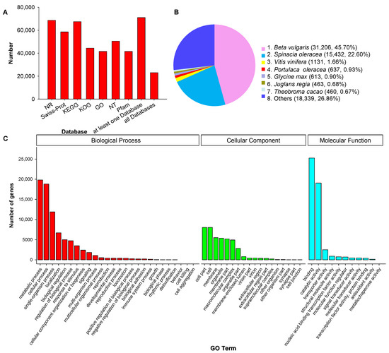 We compared the transcript sequences to NR by homologous species analysis. 68,630 genes were annotated, among them, Beta valgaris (31,206; 45.70%), Spinacia oleracea (15,432; 22.60%), Vitis vinifera (1131; 1.66%), and P. oleracea (637; 0.93%) were the top four species of transcripts distributed (Figure 3B). GO analysis demonstrated that 41,535 unique genes were enriched significantly in three major categories: molecular function (MF), cellular component (CC), biological process (BP). In these three categories, the most abundant GO terms were cellular process and metabolic process in BP, catalytic activity and binding in MF, cell and cell part in CC (Figure 3C).