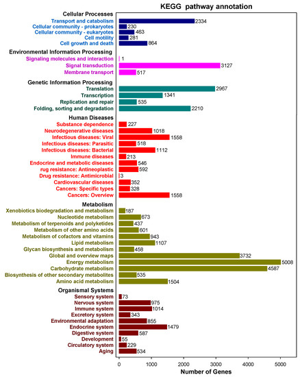 A total of 67,426 sequences were interpreted by the KEGG data storage and plotted to 366 operative catalogs in purslane. “Metabolism” was the largest transcript category. The first three transcripts-related pathways were carbon metabolism (3007, 4.46%), carbon fixation in photosynthetic organisms (2304, 3.42%) and pyruvate metabolism (2153, 3.19%) (Figure 4 and Supplementary Table S1). A large number of genes, especially interrelated in salt-tolerance and the fatty acid component of purslane, were annotated, such as oxidative phosphorylation (l073), plant hormone signal transduction (506), fatty acid biosynthesis (246), biosynthesis of unsaturated fatty acids (94) and α-linolenic acid metabolism (199) (Supplementary Table S1).