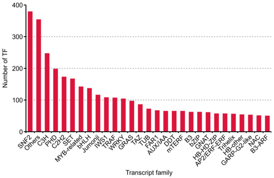 During plant growth and development, TFs and transcription regulation (TRs) acting as dominant characters. Four thousand one hundred eighty transcripts, including 2211 putative TF and 1969 TR from 86 families, were predicted with iTAK software [26] (Supplementary Table S2). The top 30 families annotated are shown in Figure 5.
