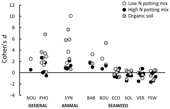 Effect (Cohen’s d) of applying different classes of PGPs (general, animal-derived, seaweed-based) as a root drench on plant shoot growth when plants were grown in a low nutrient potting mix, high nutrient potting mix or organic topsoil. Positive effects represent situations where the PGP caused an increase in shoot growth compared to plants treated only with water. See Supplementary File S1 for results of each individual trial. For product codes see Table 1.