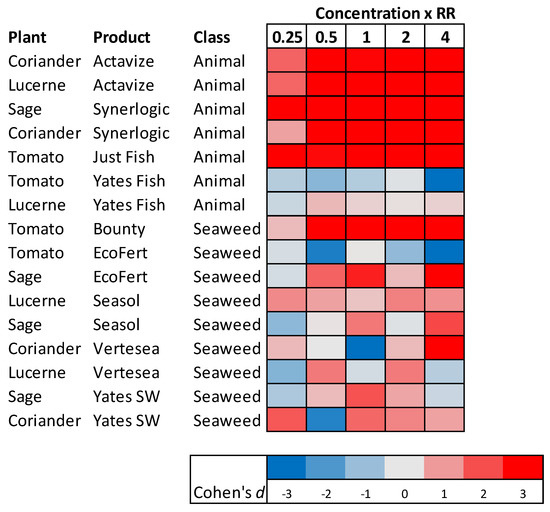 Heat map illustrating the effects (Cohen’s d) on plant shoot growth of applying seaweed-based and animal-derived PGPs as a root drench at different concentrations (x RR; recommended rate). Positive effects represent situations where the PGP caused an increase in shoot growth compared to plants treated only with water. See Supplementary File S1 for results of each individual trial.