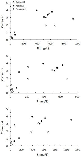 The relationship between the effect (Cohen’s d) on plant shoot growth of applying different PGPs (general, animal-derived and seaweed-based) and the NPK content of the applied solutions of PGPs. PGPs were applied as a root drench to low nutrient potting mix. The effect is the weighted mean effect of each PGP tested on multiple plants calculated using REML analysis (see Figure 1b; Supplementary File S2).