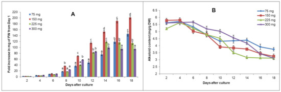 The alkaloid contents of each sample were also analyzed. The obtained results shown in Figure 2B,D,F indicate that cells in suspension culture metabolized alkaloids in lower amounts than those in plants and calli. As observed in the calli as well in suspended cells, the alkaloid accumulation was related to the culture growth rate. For example, the alkaloid content in cells grown in the optimal temperate of 25 °C was reduced from 6.793 to 3.844 mg/DW (43.4% lower) after 18 days, while there was 26.2%, 17.4% and 28.7% decrease in the lower growth cultured condition of 20 °C, 30 °C and 35 °C, respectively. Therefore, the best conditions for maximizing biomass were not optimal for alkaloid production.