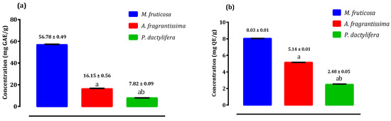 Total phenolic, flavone and flavonol content of pollen extracts of selected species from Palestine. (a): Total phenolic; (b): flavone and flavonol content. a p < 0.05 as comapred to pollen extract of Micromeria fruticosa in the same column; b p < 0.05 as compared to to pollen extract of Achillea fragrantissima in the same column.