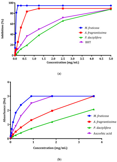 The IC50 values of DPPH radicals scavenging for pollen extracts of Micromeria fruticosa, Achillea fragrantissima, and Phoenix dactylifera were 0.047, 0.295, and 1.820 mg/mL, respectively (Table 2). Pollen extracts from Micromeria fruticosa and Achillea fragrantissima scavenged DPPH free radicals more effectively than pollen extracts from Phoenix dactylifera, which demonstrated a moderate activity. Figure 2a illustrates the dose–response curves of the DPPH radical activities of pollen extracts from Micromeria fruticosa, Achillea fragrantissima, and Phoenix dactylifera. The IC50 values of ferric reducing antioxidant power of pollen extracts from Micromeria fruticosa, Achillea fragrantissima, and Phoenix dactylifera, are summarized in Table 2. The IC50 values were found to be 0.039, 0.248 and 0.585 mg/mL, respectively. The dose–response curves of FRAP radical activities of pollen extracts are shown in Figure 2b.