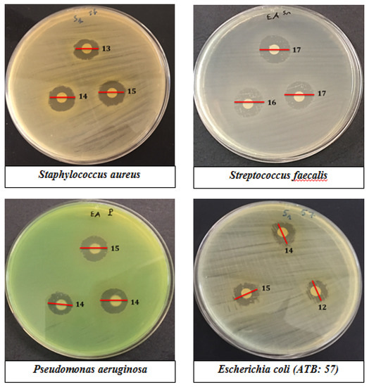 The antibacterial activity of the hydroalcoholic extract from these pollens was studied by the agar well diffusion assay method using the Gram-positive strains (S. aureus, S. faecalis) and the Gram-negative strains (E. coli, P. aeruginosa). The pollen extract of Micromeria fruticosa showed remarkable activity against pathogens tested with inhibition zones ranging from 13.66 ± 1.5 mm to 16.33 ± 1.5 mm (Table 3, Figure 3). The highest bacterial inhibition zone for the pollen extract of Micromeria fruticosa was observed against S. faecalis (16.33 ± 1.5 mm), followed by staphylococcus aureus (14.33 ± 0.6 mm), P. aeruginosa (15.66 ± 1.5 mm), and E. coli (13.66 ± 1.5 mm). The pollen extract of Achillea fragrantissima was active against S. aureus with an inhibition zone of 16.33 ± 0.6 mm, P. aeruginosa (15.33 ± 1.15 mm), and S. faecalis (14.33 ± 1.15 mm). The pollen extract of Phoenix dactylifera showed activity against S. faecalis (14.66 ± 0.6 mm) and P. aeruginosa (14 ± 1 mm). Ethanol (70%) was used as control and did not have any effect on all studied strains.