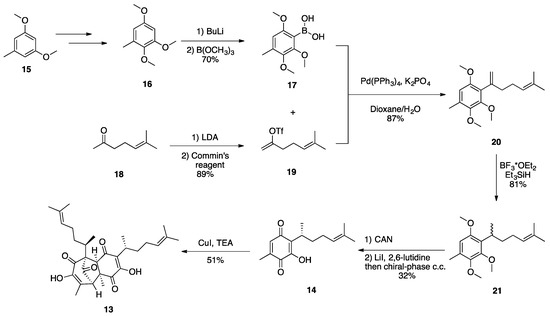 The total synthesis of this marine dimer was published in 2019, and it was based on a copper-catalyzed intermolecular [5+2] homodimerization of (-)-perezone (14) [21]. The synthetic process started from 2,3,5-trimethoxy toluene (16) obtained from the commercially available 3,5-dimethoxy-toluene (15) via a known three-steps sequence [22]. Compound 16 was then transformed in the corresponding boronic derivative 17 after mono-lithiation and subsequent entrapment with thimethylborate. Boronic acid 17 underwent a cross coupling reaction with triflate 19 [23,24] under Suzuki-Miyaura [25] conditions furnishing compound 20 in excellent yield. The latter went through a chemoselective hydrogenation leading to the synthon 21 as racemate, while all attempts to enable an enantioselective hydrogenation were unfruitful. The key intermediate 21 was oxidated with cerium (IV) ammonium nitrate (CAN) and demethylated with LiI giving (±)-perezone. The racemate was resolved by using a chiral-phase column chromatography obtaining the enantiopure (-)-perezone (14). The biclyclo- [3.2.1]octadienone core of (–)-perezoperezone (13) was finally constructed through an intermolecular [5+2] homodimerization catalyzed by CuI, forming two new C-C bonds with the installation of four stereogenic centers in a single step (Scheme 2).