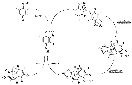 The proposed mechanism proceeded through a double Michael addition thanks to the formation of the stabilized cuprate complex CuI (22). The presence of sterically hindered substituents (i.e., benzyl groups) on the quinone moiety induced a retro-dimerization process leaving the starting quinone untouched. A radical pathway was excluded: the yield of the dimerization process was not affected by the presence of radical scavengers such TEMPO and BHT (Scheme 3).