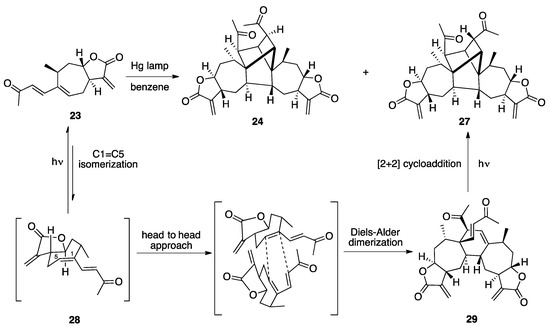 The irradiation of xanthatin (23) with Hg lamp in benzene [32,33] provided a mixture of mogolide A (24) and epi-mogolide A (27), in a 74% combined yield, through a tandem process in which a head-to-head Diels-Alder reaction was followed by a [2+2] cycloaddition. From a mechanistic point of view, upon irradiation compound 23 could undergo C1=C5 double bond isomerization furnishing a highly reactive intermediate 28, that quickly dimerize through a head-to-head Diels-Alder reaction giving compound 29. The latter, after further irradiation, could transform into mogolide A (25) and epi-mogolide A (27) through an intramolecular [2+2] cycloaddition. Notably, the authors postulated the formation of intermediate 28 [34,35,36,37], characterized by an unusual trans-cycloheptenone moiety, to justify the stereochemical outcome of compound 29. A possible radical pathway was excluded: the dimerization process proceeded smoothly in the presence of radical scavengers (Scheme 4).