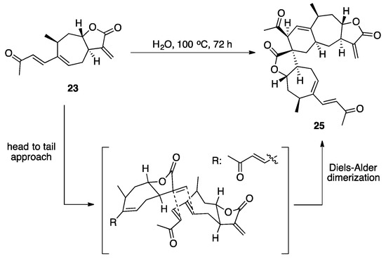 The last member of the magolides family, magolide B (25), was finally obtained by switching from a photo-induced dimerization to a thermal one. The treatment of xanthatin (23) in H2O at 100 °C for 72 h led to the formation of dimer 25 in 22% yield, through a concerted Diels-Alder reaction in a head-to-tail fashion. The reaction was successfully in H2O, probably due to a solvent-induced combination of hydrophobic interactions and hydrogen bonding effect (Scheme 6) [41].