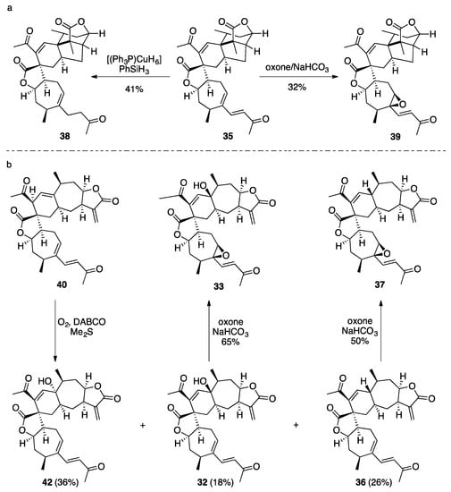 Pungionolide A (32) and its C-11 epimer (42) were directly obtained from pre-pungionolide (40), through an allylic oxidation, upon treatment with DABCO in presence of molecular oxygen followed by a reductive work-up (Me2S). In the same conditions, pungionolide E (36), a double-bond migration product of 40, was also formed in 26% yield. Finally, 32 and 36 gave pungiolides B (33) and L (37), respectively, after regio- and diastereoselective epoxidation of C1=C5 double bond with oxone/NaHCO3 (Scheme 8b) [49].