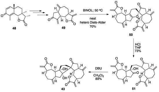 The biomimetic total synthesis of (+)-ainsliadimer A (43) was reported in 2010 starting from the commercially available sesquiterpene lactone santonin (48) [54]. The first part of the synthetic process was dedicated to the synthesis of dehydrozaluzanin C (49) as key monomer, obtained in ten synthetic steps from 48. With synthon 49 onhand, the hetero Diels-Alder dimerization was deeply studied by testing different conditions, pointing out how high temperatures and the presence of Lewis acids led to a total decomposition of the starting material. The turning point was the introduction of hydrogen bond donors as catalyst, obtaining the best results of conversion and yield with BINOL. Eventually, compound 50 was obtained in 71% yield in presence of 1 eq. of catalyst at 50 °C for 60 h without solvent. The (+)-ainsliadimer A (43) was finally obtained through a mild acidic hydrolysis followed by an intramolecular aldol reaction in high diluted conditions. A possible explanation for the positive action of BINOL could be its bidentate nature that helped the orientation of the two monomers allowing the [4+2] hetero-cycloaddition (Scheme 9).