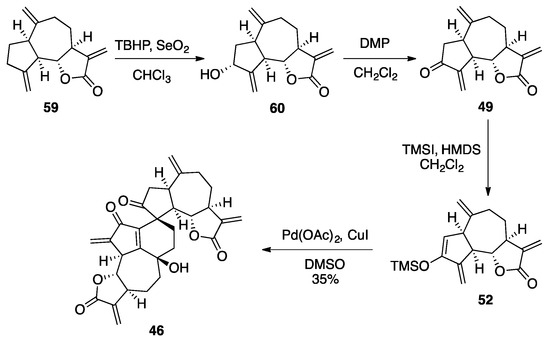 Recently, Tang’s group, taking advantage of the previous studies, reported a more concise synthetic strategy of gochnatiolide B (46) from commercially available dehydrocostunolactone (59) in only four synthetic steps with an overall of 26% yield. The [4+2] cycloaddition, exploiting the already described “copper effect,” allowed to obtain the final product in 35% yield (Scheme 12). All the reported synthetic endeavors fostered the characterization of the pharmacological profile of this natural dimer, that exhibited a potent inhibitory activity in in vivo studies against proliferation of human cancer cell lines by acting as a multi-target agent [55].