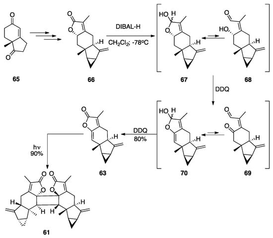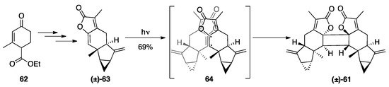 In the synthetic strategy proposed by Liu, (±)-chloranthalactone F (61) was synthetized through a photodimerization of (±)-chloranthalactone A (63) obtained from Hagemman’s ester (62) in fifteen steps [62,63]. Eventually, a hexane solution of 63 was irradiated with a Hg lamp leading the desired dimer (±)-61 as single diastereoisomer in a yield 69%. The authors suggested that the high diastereoselectivity was given by the perfect electrical and orbital interaction between γ-alkylidenbutenolide segments in the transition state 64 (Scheme 13).