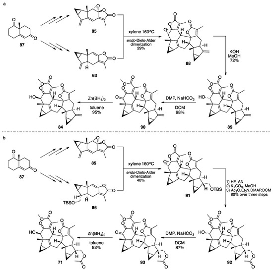 Compound 88, as precursor of shizukaol A (84), was obtained as main product by reacting the intermediate 85 with chloranthalactone A (63) in presence of butylated hydroxytoluene (BHT) at 160 °C in xylene. In order to “quench” the homodimerization of diene 85, it was essential that a high diluted solution of the latter was added very slowly into a refluxing dilute solution of 63. Alkaline and selective methanolysis of 88 furnished compound 89 that underwent epimerization of the secondary alcohol through an oxidation-reduction sequence affording the desired shizukaol A (84) (Scheme 16a).