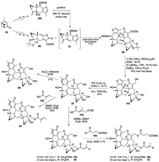 Compound 99, the basic skeleton to chlorajaponilide C (72), shizukaol C (94) and I (95), multistalide B (96) and sarglabolide I (97), was obtained by reacting the diene precursor 100 with dienophile 98 in toluene and pyridine at 200 °C. The synergic action of pyridine and heating process induced the elimination of the acetate moiety from 100 generating the furyl diene 76 that underwent intermolecular [4+2] cycloaddition, giving the desired endo-adduct 99. Global deprotection and selective reduction of the ethyl ester group furnished the intermediate 101 that was transformed in the desired sarglabolide I (97) through photolytic oxidation of the furan moiety, followed by methylation of the resulting acid. At this juncture, compound 97 was selectively acetylated or esterified with tiglic acid (102) to give respectively multistalide B (96) and shizukaol C (94). On the other side, the esterification of 97 with compound 103 gave the intermediate 104, which after deprotection furnished shizukaol I (95). Chlorajaponilide C (72) was finally achieved through esterification of 104 with the acyl-chloride 105 followed by deprotection of the silyl group (Scheme 17).