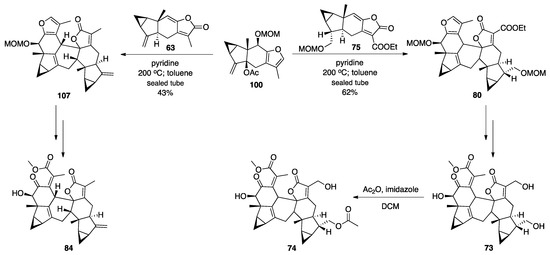 Otherwise, the reaction between diene precursor 100 and chloranthalactone A (63) in toluene and pyridine at 200 °C, furnished the intermediate 107 that after acidic removal of the MOM protection and oxidative manipulation of the furan moiety furnished the desired shizukaol A (84) in 54% yield over two steps. The two remaining congeners were finally achieved by reacting the diene precursor 100 with the dienophile 75 leading compound 80, that following the first generation pathway [70] led to sarcandrolide J (73) and shizukaol D (74) (Scheme 18).