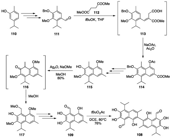 In 2013, Wang’s group published its approach to obtain 108 through the oxidative dimerization of two equivalents of hemigossypol (109) [78]. The latter was synthesized on a gram scale in eighteen steps from the commercially available carvacrol (110). The synthetic pathway from 110 to 109 was characterized by a Stobbe condensation between 111 and 112, followed by an electrophilic cyclization affording the highly substituted naphthalene 114. The latter, after protecting groups swap and redox adjustments, furnished the key intermediate 115 that underwent a Michael addition on the ortho-quinone methide 116 giving compound 117. Finally, synthon 117 was transformed in the desired monomer 109. At this juncture, the oxidative dimerization was achieved by treating 109 with tert-butyl peracetate (tBuO2Ac) in 1,2-dichloroethane at 80 °C furnishing (±)-gossypol (108) in 76% yield (Scheme 19).