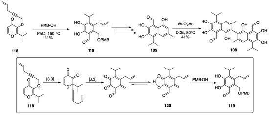 In 2018, an interesting approach, based on a cascade Claisen rearrangement, was proposed by Zhu’s group where the key intermediate 119 was obtained in a single step starting from the pyrone 118 [79]. The latter was treated with p-methoxybenzyl alcohol in chlorobenzene at 150 °C for 13 h leading compound 119 in 41% yield with all the requested functional groups preinstalled. The authors proposed as mechanism a double allenylic-Claisen rearrangement postulating the formation of a quinone methide (120) easily trapped by benzylalcohol. At this juncture, compound 119 was transformed in hemigossypol 109 in fourteen steps, mainly characterized by protecting groups swap and redox adjustments. The (±)-gossypol (108) was obtained in 41% yield applying the same protocol previously reported by Wang (Scheme 20).