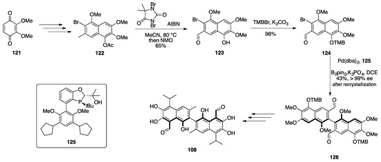 A completely different approach to obtain (−)-(R)-gossypol (108) was proposed in 2020 by Tang’s group, where an enantioselective Suzuki-Miyaura cross-coupling was used as key reaction of the synthetic pathway [80]. Enatiomerically pure (−)-108 was obtained in ten synthetic steps from the easily accessible quinone 121 that was efficiently manipulated to obtain naphthylene 122. A one-pot two-step sequence consisting of benzylic bromination of 122 and subsequent treatment with N-methylmorpholine N-oxide afforded the benzaldehyde 123, that after protection of the phenol moiety as 3,4,5-trimethoxybenzyl derivative (124), underwent a domino Miyaura-borylation/Suzuki-coupling reaction, catalyzed by (R,R)-BaryPhos 125, affording binaphthyl key synthon 126 in 43% yield and >99% ee after recrystallization. The latter was finally elaborated to produce (−)-(R)-gossypol (108) (Scheme 21).