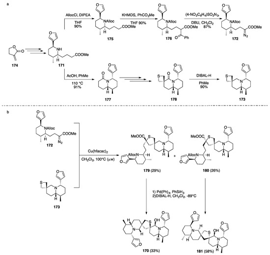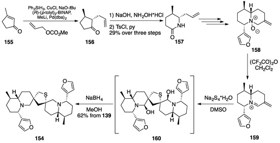 - Jansen, D.J.; Shenvi, R.A. Synthesis of (−)-Neothiobinupharidine. J. Am. Chem. Soc. 2013, 135, 10–13. [Google Scholar] [CrossRef]