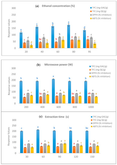 Effects of single factors: (a) ethanol concentrations, (b) microwave power, and (c) extraction time on total phenolic content (TPC), total flavonoid content (TFC), 1-diphenyl-2-picrylhydrazyl (DPPH), and 2,20-azino-bis (3-ethylbenzothizoline-6-sulfonic acid) (ABTS), respectively, of B. lupulina leaf extract. One-way ANOVA was used to compare the significant differences among groups. Different letters (a, b, c, d, and e) in blue, red, black, and yellow colors, respectively, represent significant differences (p < 0.05) in TPC, TFC, DPPH, and ABTS values among groups. The same letter indicates no significant difference (p > 0.05) among groups.