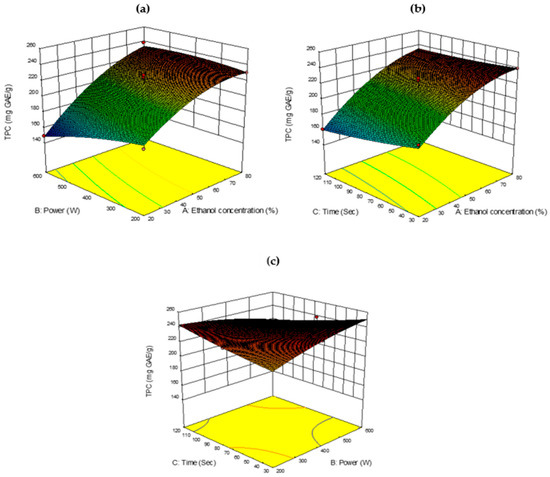 In the present experiment, as the ethanol concentration increased from 20 to 80% (v/v), the yield of TPC in the extract increased, as shown in Figure 2a. Ethanol concentration also showed significance in quadratic and interactions with microwave power, and non-significance (p > 0.05) in interaction time. The ability of the mixture in any proportion between water (strong polar solvent) to ethanol (low polar solvent) was cited to increase polarity of the complex solvent [51]. In the present study, 80% (v/v) ethanol was a good proportion to obtain a high TPC yield. With respect to microwave power, TPC reached its maximum at 400 W and slightly dropped with an increase in microwave power (Figure 2b). This could be due to the thermal degradation of phytochemicals at higher microwave power levels. The higher heat generated by higher microwave power with volumetric heating could be too strong for plant cells, causing the breakdown of phytochemicals [29].