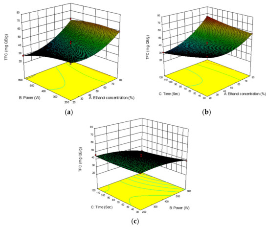 Heat generated by microwave power generally caused interactions between the sample and solvent, which caused disruption of the sample to occur and the release of analyte in the solvent [53,54]. It was reported that an increase in the heat produced increase in the yield of the extract [55] and at a faster rate [53]. Heating could also cause an increase in solubility of flavonoids from the plant matrix by disrupting the phenolic matrix bonds [56]. Figure 3a shows the interactions between ethanol concentrations and microwave power on the yield of TFC. An increase in microwave power from 200 to 400 W in the present study caused an increase in TFC yield but caused a decrease beyond 400 W. This could be the degradation of thermolabile compounds due to the heat produced [54,57]. Figure 3b shows an increase in the value of TFC with an increase in ethanol concentrations and extraction time. The positive interaction of solvent concentration and time could enhance solubility of TFC at a minimum level of heating power, which suggests it as an alternative way to avoid the degradation of compounds. However, the interaction of time and microwave power showed a negative effect on TFC yield (Figure 3c). The increase in extraction time and microwave power caused a decrease in TFC yield. This could be related to the high dielectric properties of ethanol as a polar solvent, and combining it with water could cause an increase in the rate of heating that tends to degrade the compounds over a prolonged exposure to microwave power.